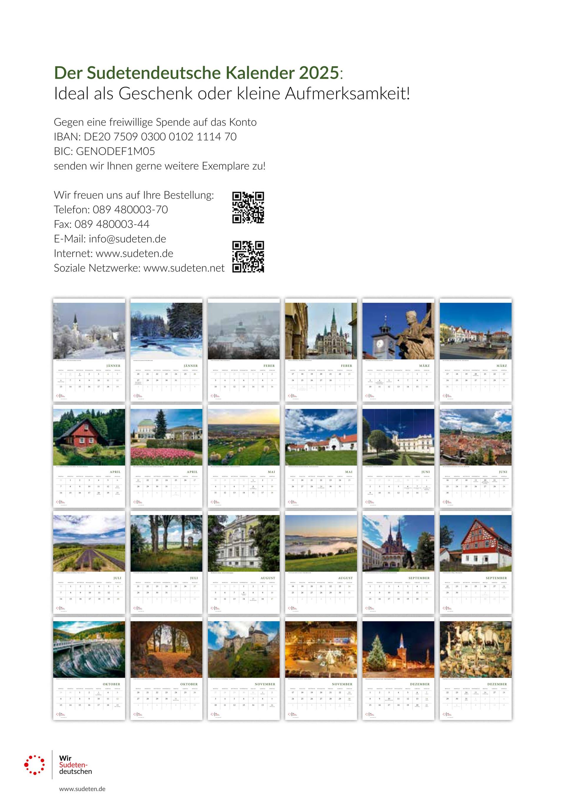 Der Kalender ist ein Geschenk von uns an alle, die unsere Arbeit für den Erhalt des sudetendeutschen Kulturerbes und für die Völkerverständigung in Europa unterstützen möchten. Schreiben Sie uns einfach eine E-Mail an info@sudeten.de, um Ihren Kalender bequem nach Hause geliefert zu bekommen. Gerne können Sie mehrere Kalender für Ihre Liebsten bestellen.
