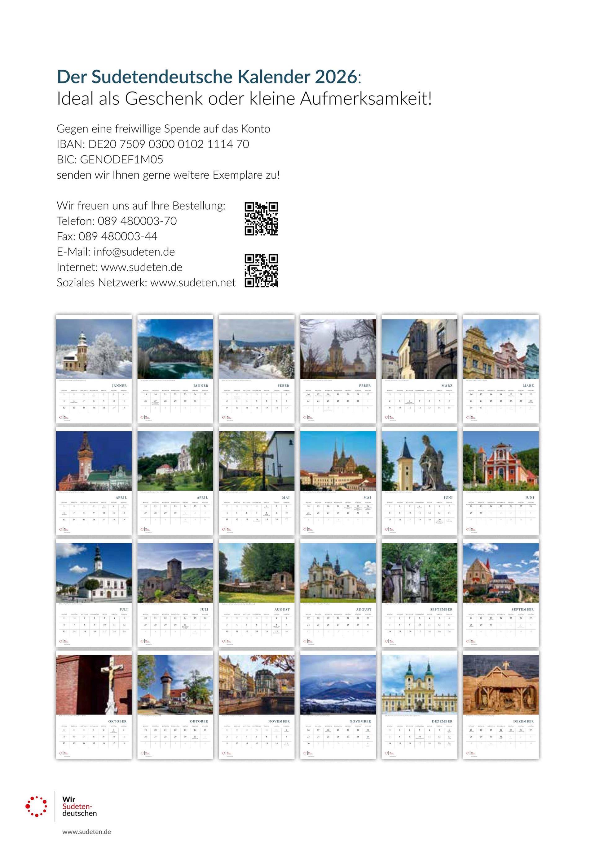Der Kalender ist ein Geschenk von uns an alle, die unsere Arbeit für den Erhalt des sudetendeutschen Kulturerbes und für die Völkerverständigung in Europa unterstützen möchten. Schreiben Sie uns einfach eine E-Mail an info@sudeten.de, um Ihren Kalender bequem nach Hause geliefert zu bekommen. Gerne können Sie mehrere Kalender für Ihre Liebsten bestellen.